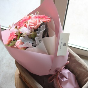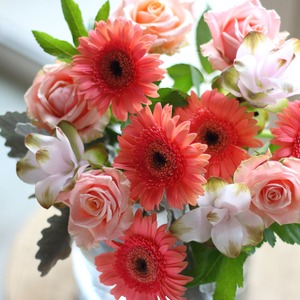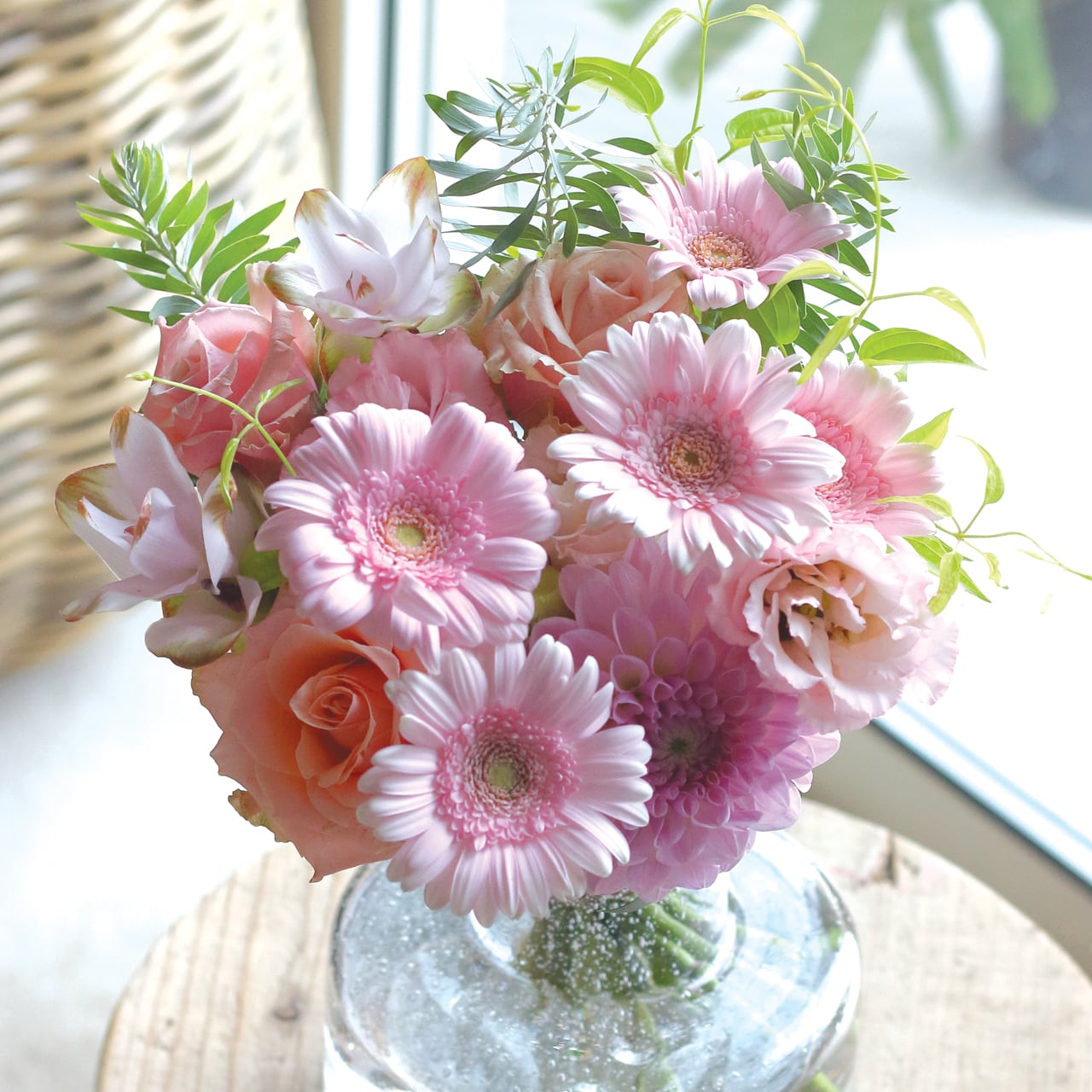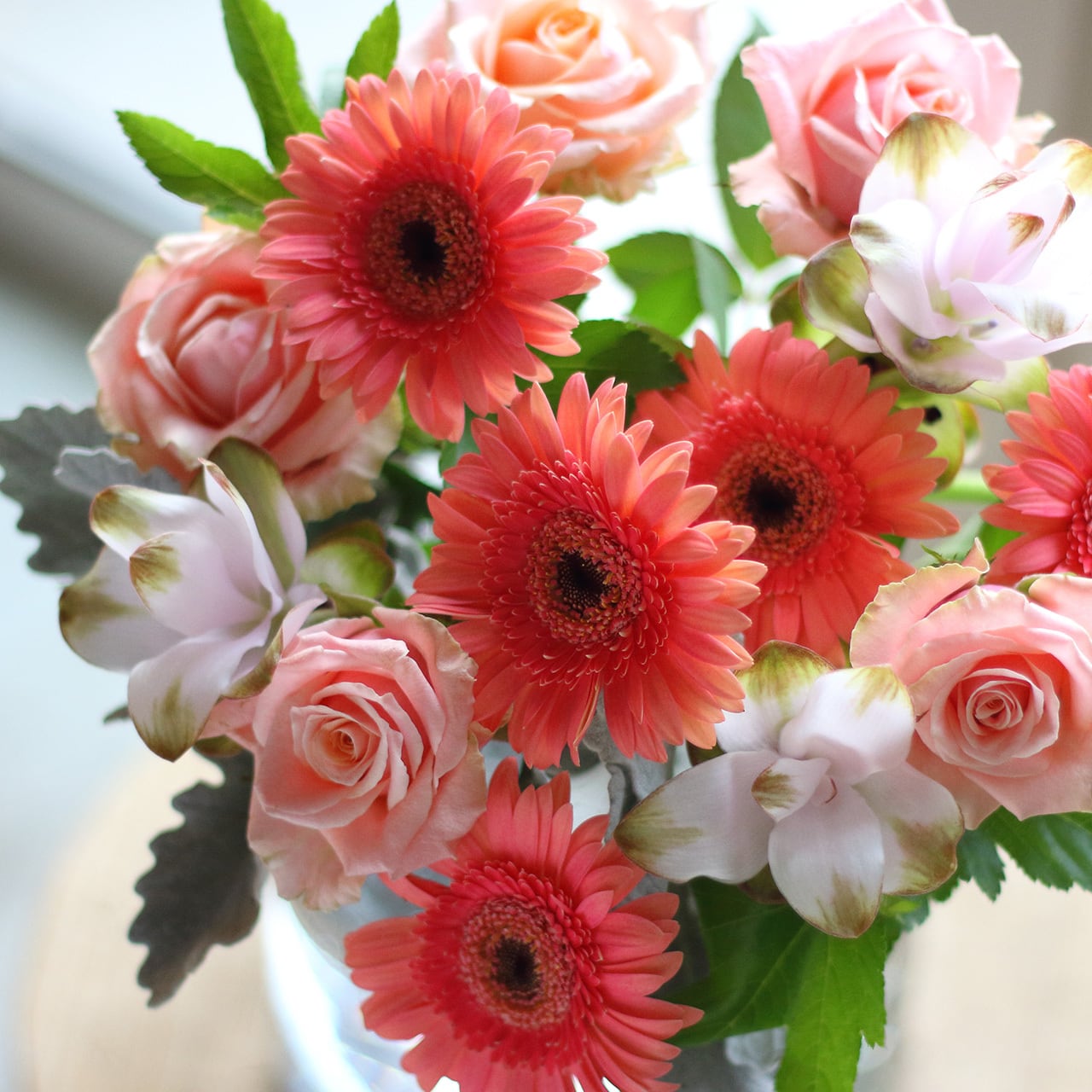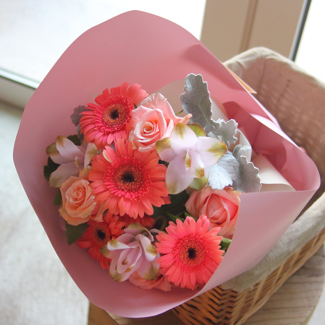 たっぷりガーベラとバラのコンパクトブーケ|誕生日・出産祝い・お手軽