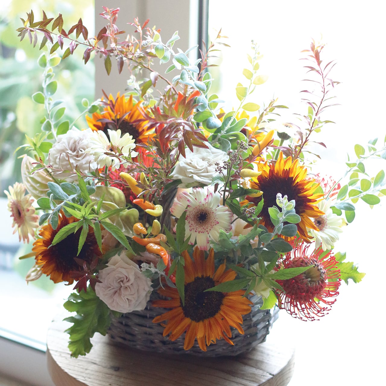 豪華に咲き誇る、季節のバスケットフラワーアレンジメント|開店祝い・長寿祝いにピッタリ